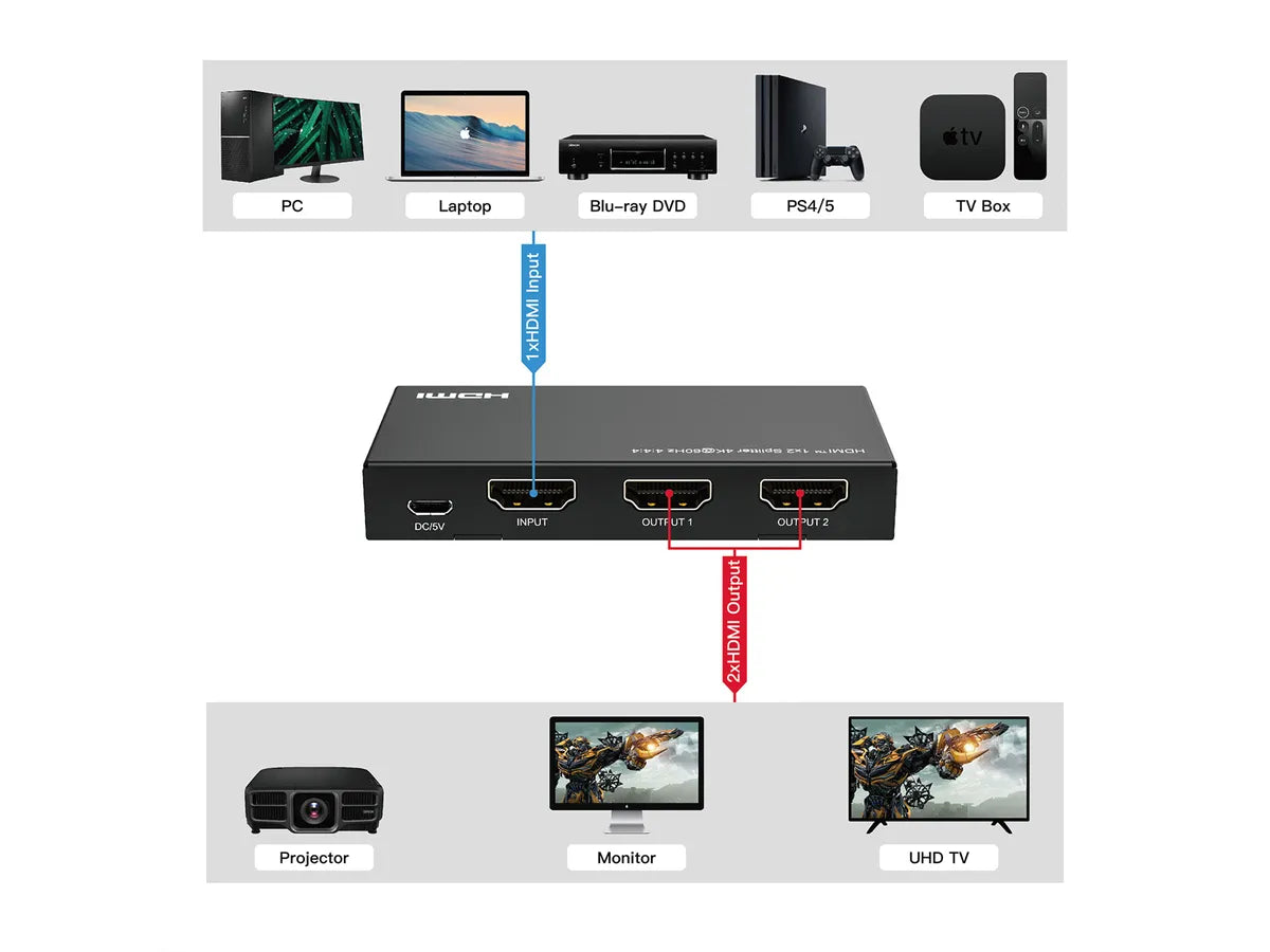 • Vervielfältigt ein HDMI Videosignal, z.B. von einem DVD-Spieler, auf 2 Ausgabegeräte mit 4K-Auflösung